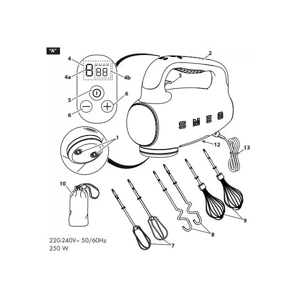 Электрический ручной миксер HMF01 подходит для приготовления множества сладких и соленых блюд: он оснащен венчиками из нержавеющей стали трех различных типов, чтобы гарантировать наилучшие результаты при обработке каждого теста.