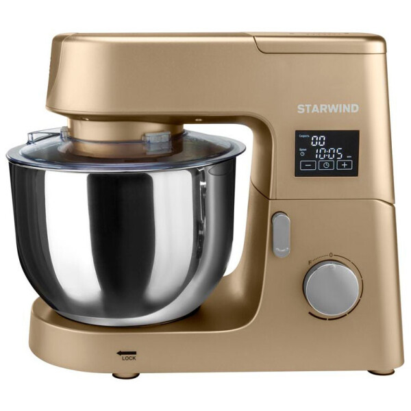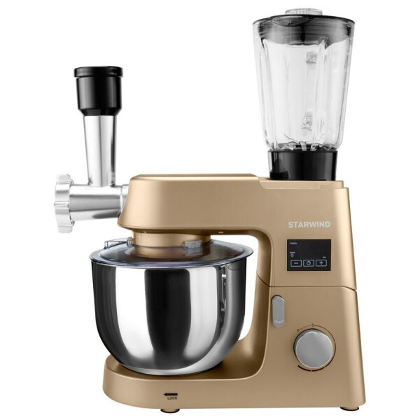 Кухонная машина Starwind SKM8193 сконструирована на основе планетарного миксера, есть возможность выбора одной из шести скоростей. Все представленные в комплекте насадки вращаются и движутся, тем самым гарантируют равномерное перемешивание и взбивание ингредиентов. Процесс приготовления еды становится удобным и максимально комфортным. Мощность кухонной машины составляет порядка 1600 Ватт, а объем предусмотренной в конструкции чаши 5 литров. Венчик для взбивания, крюк для теста, лопатка для перемешивания, защитный обод все это идет в комплекте с прибором. Прорезиненные ножки гарантируют стабильную работу на больших скоростях.