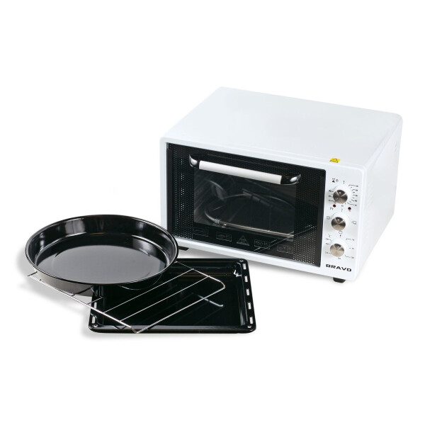 Электрическая мини-печь BRAVO FO-361W отличается высоким качеством исполнения и стильным дизайном. Полезный объем духовки 36 литров. В комплект входит решетка , прямоугольный эмалированный противень с полезной для использования поверхностью 34 сантиметра по ширине и 30 сантиметров по длине , а также круглый эмалированный противень диаметром 37 сантиметров и глубиной 4,5 сантиметра. Устройство оснащено двумя мощными тэнами по 650 Ватт, диаметром поперечного сечения 1,1 сантиметра. На дверце из закаленного стекла изображены температура и время приготовления блюд из рыбы, мяса, овощей и теста. Электрический кабель на духовке с сечением провода 0,75мм длиной 108 сантиметров. В базовую комплектацию входит переключатель четырех режимов работы духовки: КОНВЕКЦИЯ+верхний ТЭН+нижний ТЭН, нижний ТЭН, верхний ТЭН и верхний ТЭН+ нижний ТЭН, таймер на 90 минут и термостат с регулировкой температуры от 50 до 300 градусов цельсия. При включении нижнего ТЭН загорается правый световой индикатор, при включении верхнего левый. Одновременно световые индикаторы горят при включении режима работы двух тэнов. По окончании процесса приготовления звучит звуковой сигнал. Эта печь станет украшением для любой, даже небольшой кухни и несомненно порадует своего обладателя качеством приготовленных блюд. Готовьте с удовольствием вместе с BRAVO!
