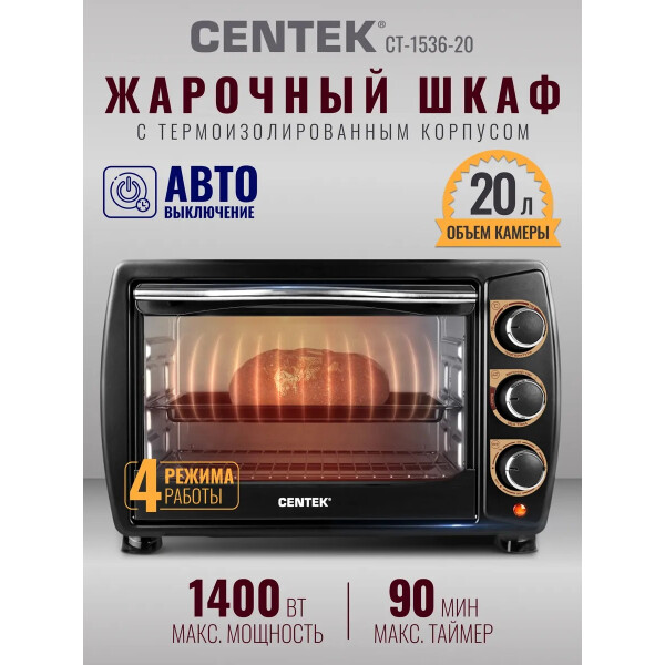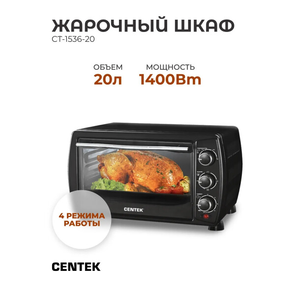 Centek CT-1536-20 – компактная настольная духовка со звуковым сигналом готовности и световым индикатором работы. Модель предназначена для использования в бытовых условиях, при длительной эксплуатации металлический корпус не подвергается нагрузкам, не выделяет вредных веществ и запаха, а значит, духовка абсолютно безопасна, что подтверждает сертификат соответствия качества продукции. Объем духового шкафа составляет 20 литров, при этом номинальная мощность достигает 1,4 кВт, этого достаточно, чтобы использовать печь для приготовления не только легких закусок, полуфабрикатов и пиццы, но и здоровой вкусной пищи. Четыре режима приготовления позволяют комбинировать степень прожарки и достигать высоких результатов в кулинарии, а интуитивно понятное управление обеспечивает легкость и простоту использования. Несмотря на скромные габариты, духовка способна поддерживать заданный режим и температурный диапазон от 100 до 320 градусов в процессе приготовления, что позволяет готовить блюда в нескольких температурных режимах, а значит, готовить с удовольствием. Более того, усиленные нагревательные элементы и специальное покрытие камеры легкой очистки обеспечивает комфорт пользования. Centek CT-1536-20 – идеальный жарочный шкаф для гурманов домашней кухни.