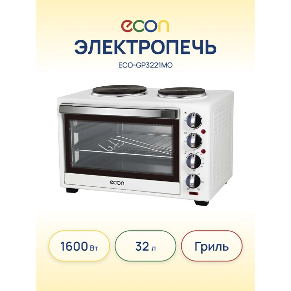 Компактная печь ECON ECO-GP3222MO с двумя конфорками, грилем, электромеханическим вертелом в комплекте и регулировкой температуры станет вашей незаменимой маленькой помощницей как дома, так и на даче.