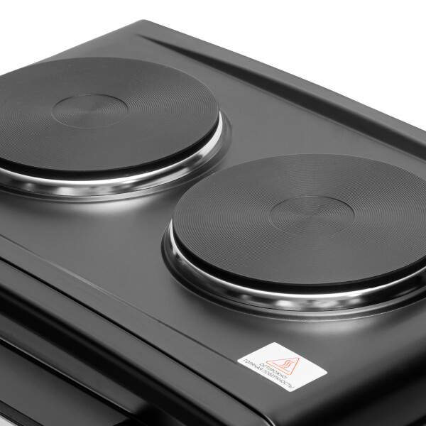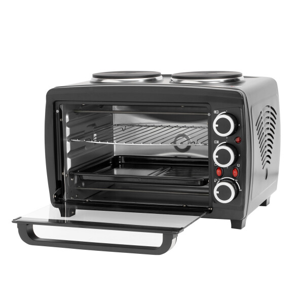 Мини-печь имеет компактный размер, объем 26 литров и 2 конфорки диаметром 155 мм.