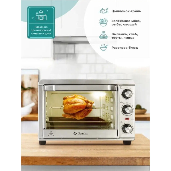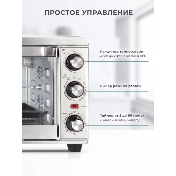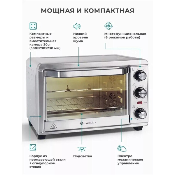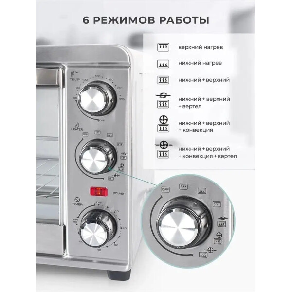 GEMLUX GL-OR-1320MN выполнена в прочном стальном корпусе и предусматривает электромеханическое управление. Вы сможете управлять режимами работы, настраивать таймер, а также задавать оптимальные температурные параметры для приготовления вашего блюда. Для этого предусмотрены поворотные ручки в правой части лицевой панели корпуса. Встроенный таймер поможет настроить электропечь на работу в течение 60 минут и меньше: по завершении приготовления сработает звуковой сигнал. Модель поддерживает шесть режимов работы, среди которых Конвекция и Гриль, позволяя вам экспериментировать с приготовлением блюд.