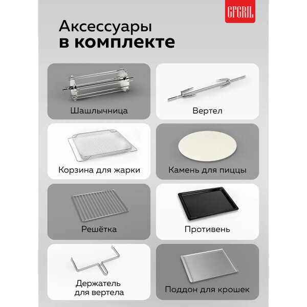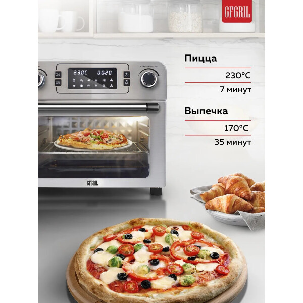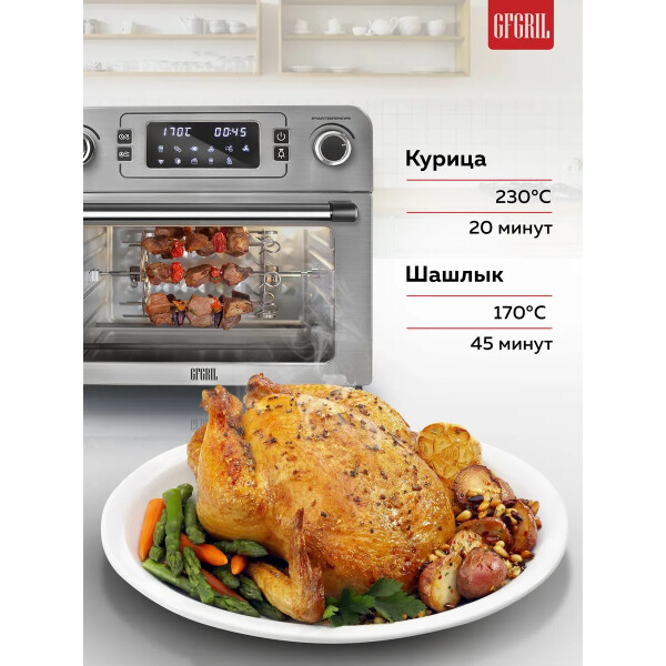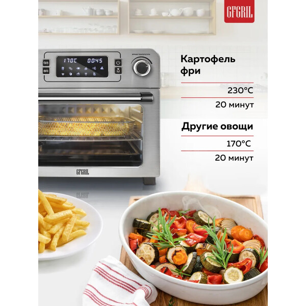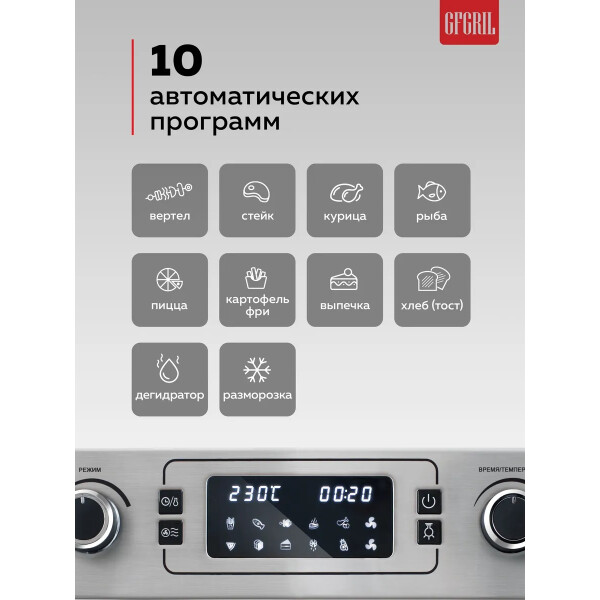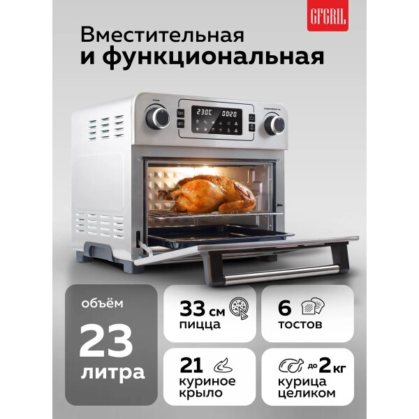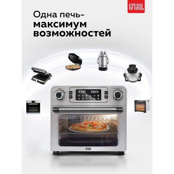 Активировав режим гриля с конвекцией, реализованный в GFGRIL GFAO-700, вы сможете побаловать гостей и домочадцев сытными мясными блюдами, покрытыми аппетитной корочкой. Вы по достоинству оцените и многофункциональный характер этого компактного устройства, ведь оно справится с приготовлением шашлыков, пиццы и позволит разморозить всевозможные продукты.