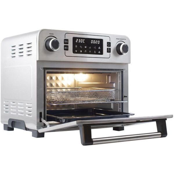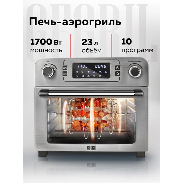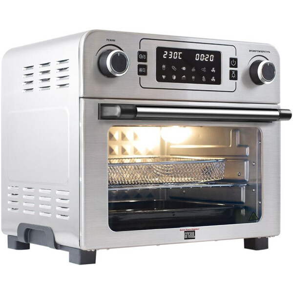 Электропечь GFGRIL GFAO-700 объемом 23 л дополнена встроенным дисплеем, оповещающим пользователя о происходящих процессах. Регулировка температурных значений и режимов производится посредством панели управления с поворотными переключателями. Мощная подсветка придется как нельзя кстати для отслеживания процесса приготовления блюд без необходимости открывать дверцу печи.