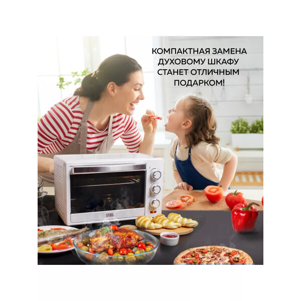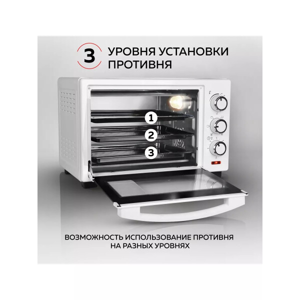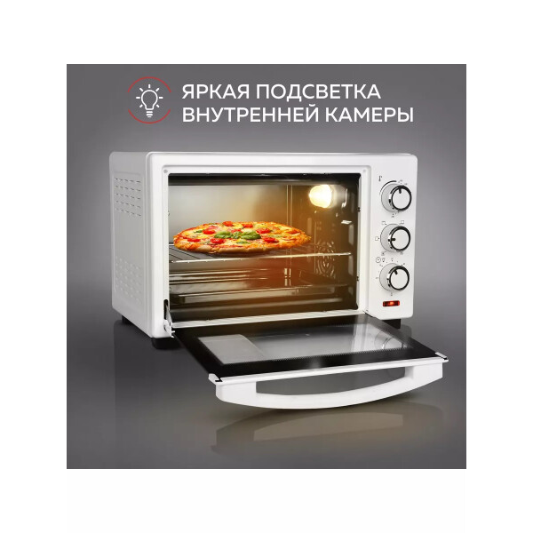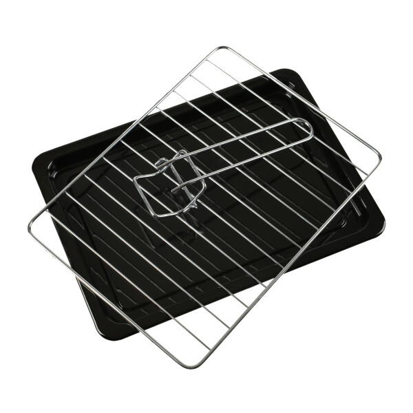 Мини-печь поставляется с противнем, металлической решеткой и зажимом для безопасного и лёгкого вынимания.