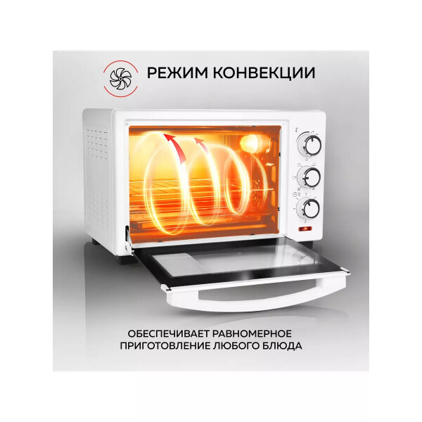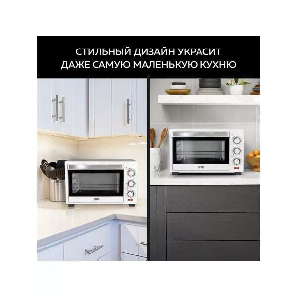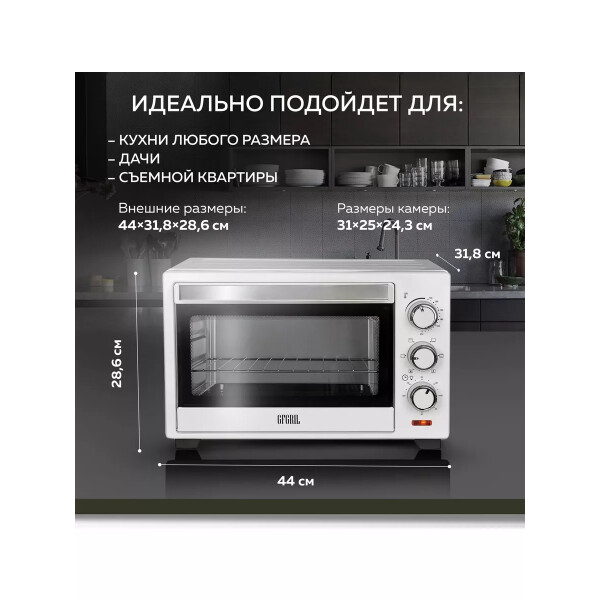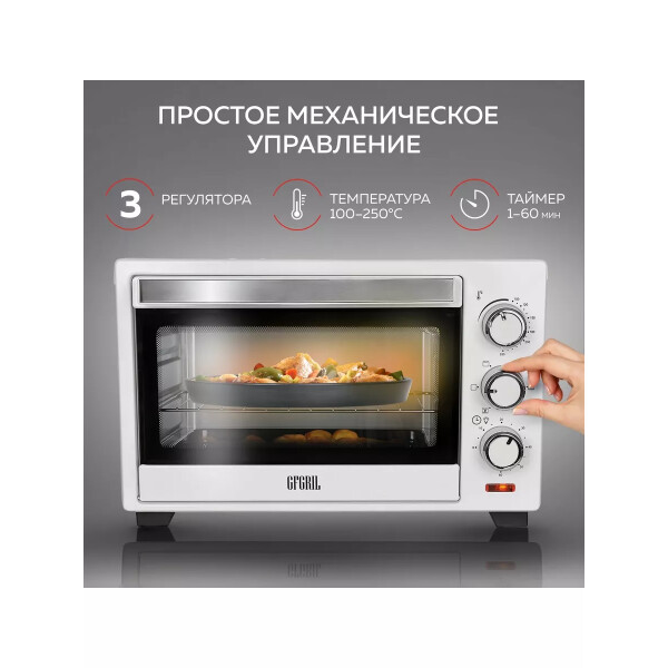 Электрическая многофункциональная мини-печь GFGRIL GFO-20W выполнена из нержавеющего металла в стильном дизайне белого цвета.