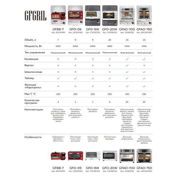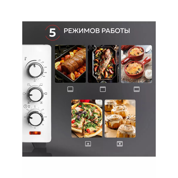 В мини-печи предусмотрено 5 режимов приготовления при различных вариациях поочерёдного и одновременного включения верхнего и нижнего нагревательных элементов для приготовления продуктов с эффектом гриля: