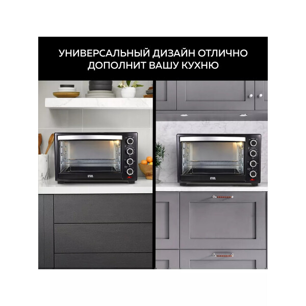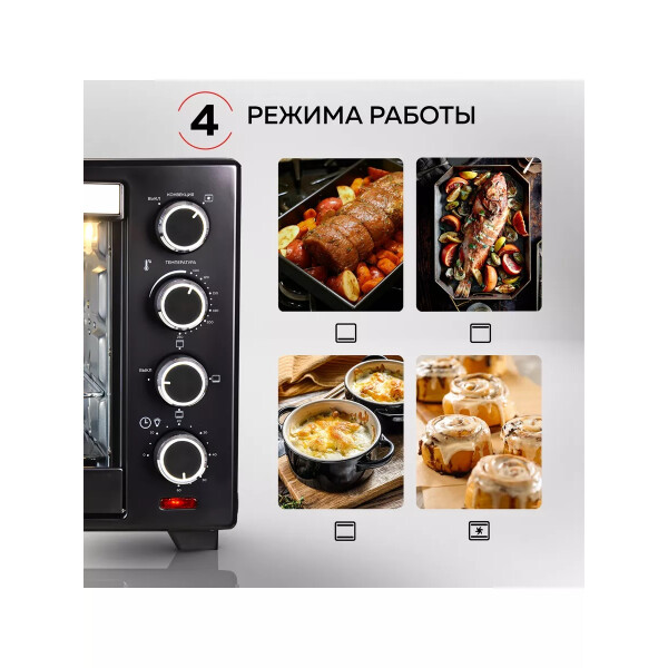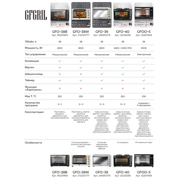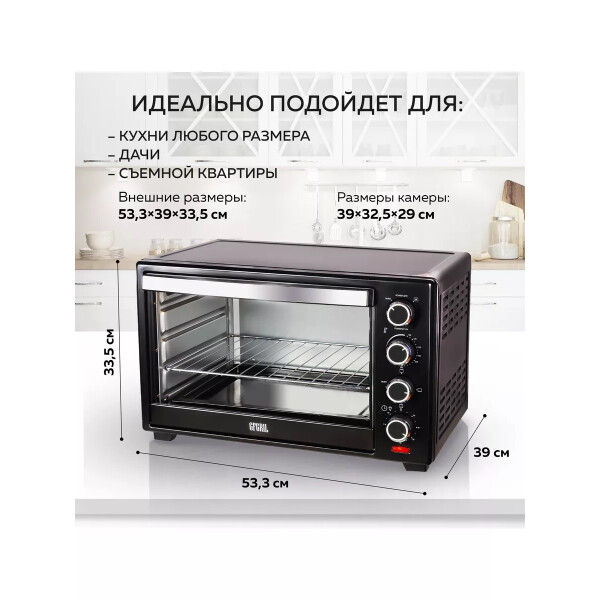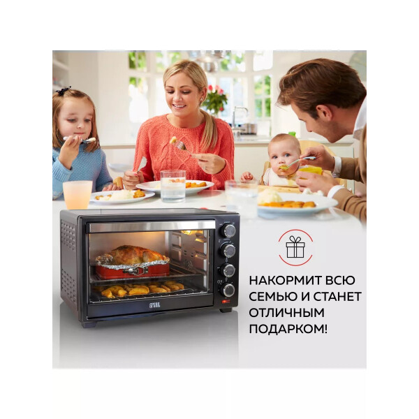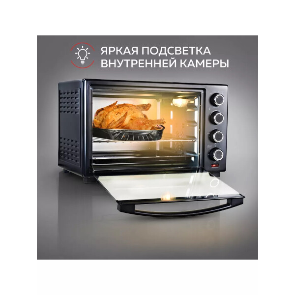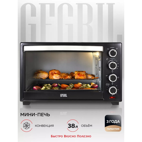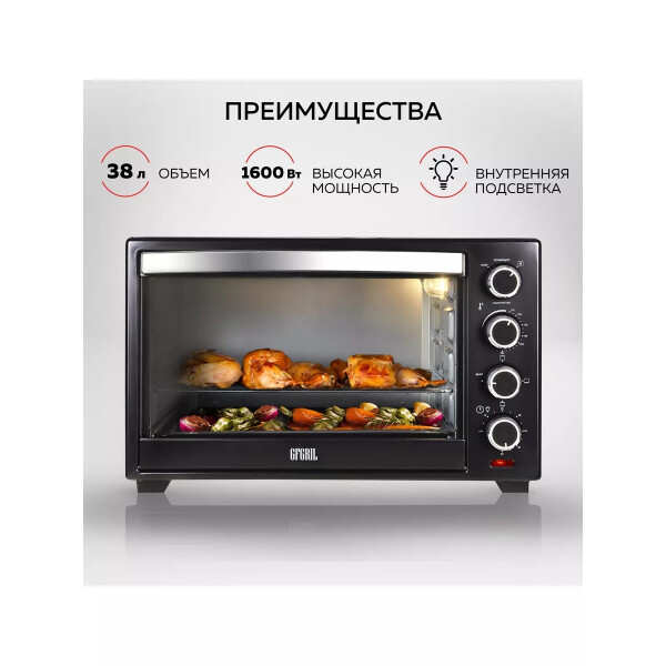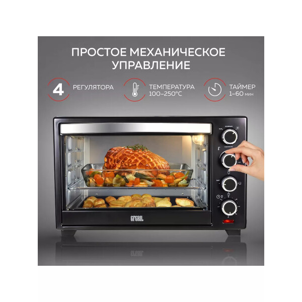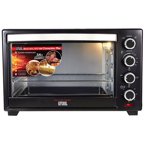 Электропечь GFGril GFO-38B – эта модель станет незаменимой помощницей на вашей кухне. Ее объем составляет 38 литров, а мощность 1600 Вт. Максимальная температура, которую позволяет настроить эта модель довольно высокая — 250º. Температурный режим регулируется вручную, благодаря чему вы можете выбрать подходящий именно для вас. Таймер прибора предназначен для того, чтобы вы точно знали, когда будет готово блюдо.
