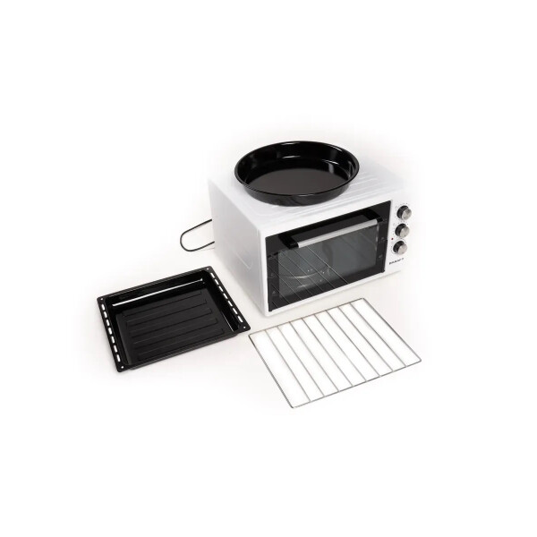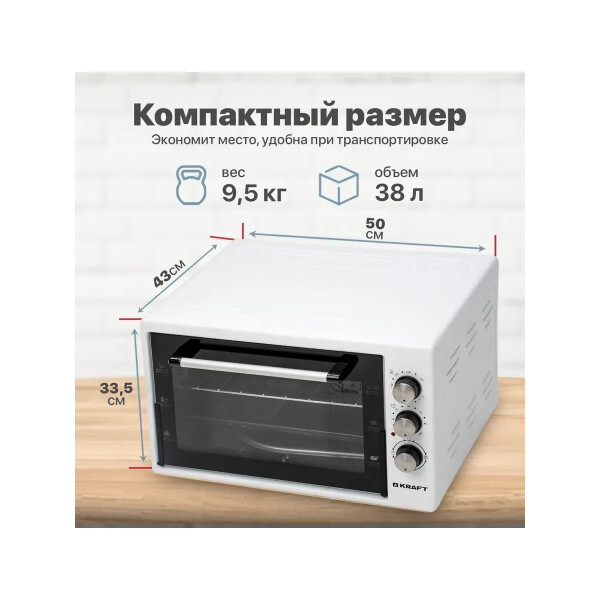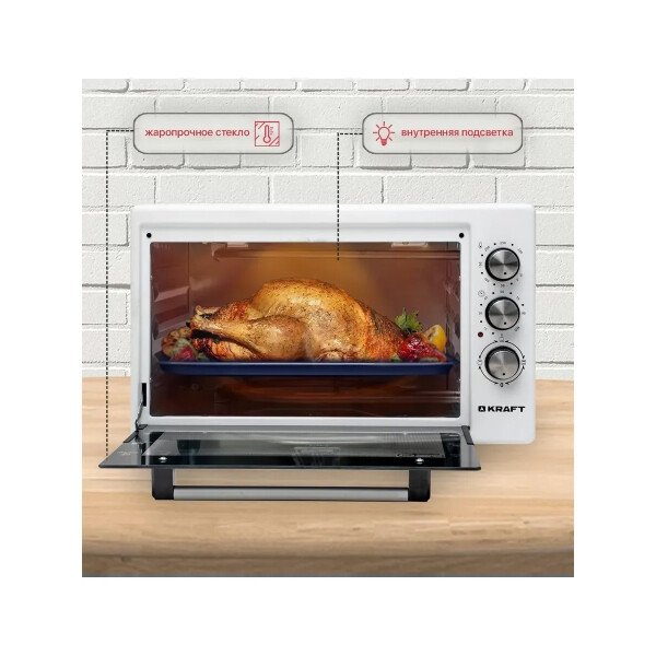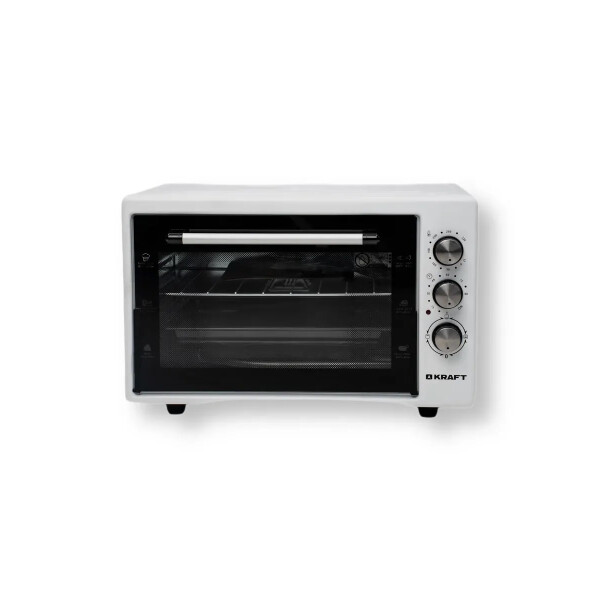 Электропечь Kraft KF-MO3801W – эта модель станет незаменимой помощницей на вашей кухне. Ее объем составляет 38 литров, а мощность 1500 Вт. Максимальная температура, которую позволяет настроить эта модель довольно высокая — 320º. Температурный режим регулируется вручную, благодаря чему вы можете выбрать подходящий именно для вас. Таймер прибора предназначен для того, чтобы вы точно знали, когда будет готово блюдо.