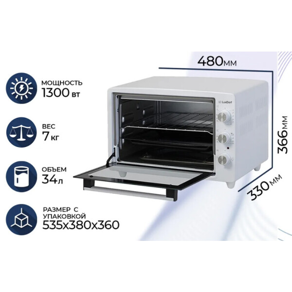 Благодаря небольшим габаритам, ее легко можно разместить в столовой зоне квартиры-студии или в пространстве миниатюрной кухни. В ширину мини-печь займет всего 53,5 см, в высоту 39,5 см, а в глубину 36 см. При этом объем духовки равен 34 литра, что позволит приготовить даже индейку.