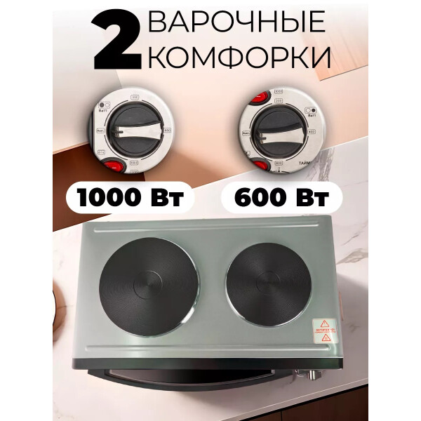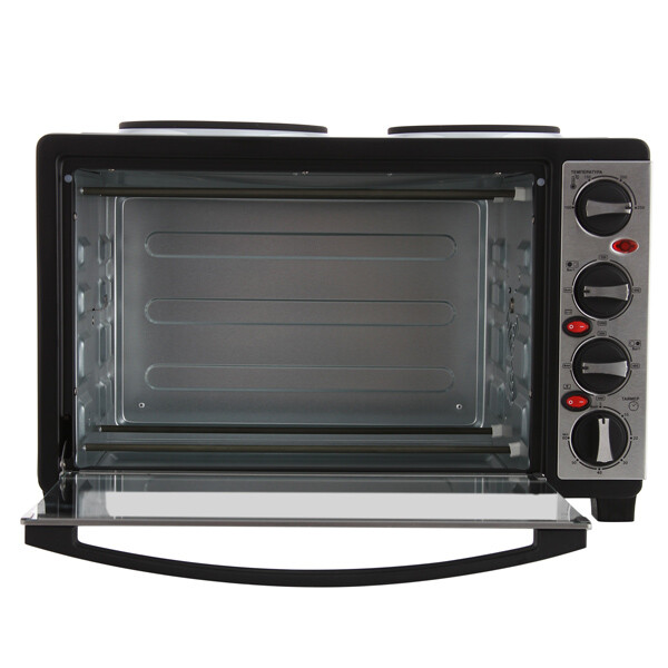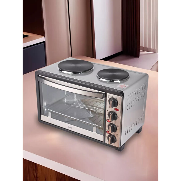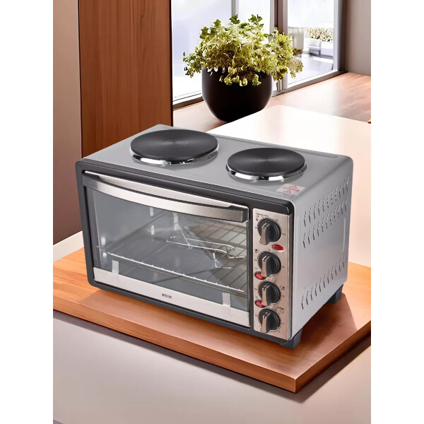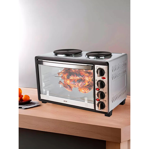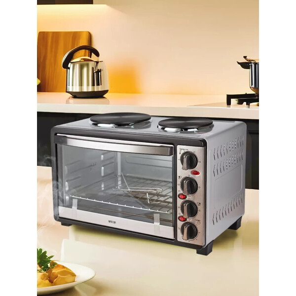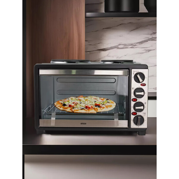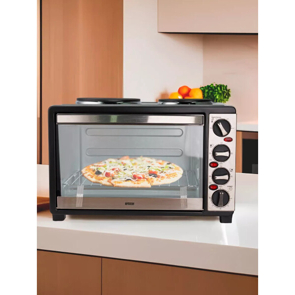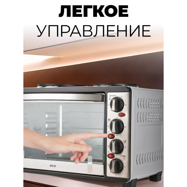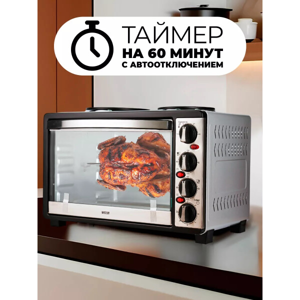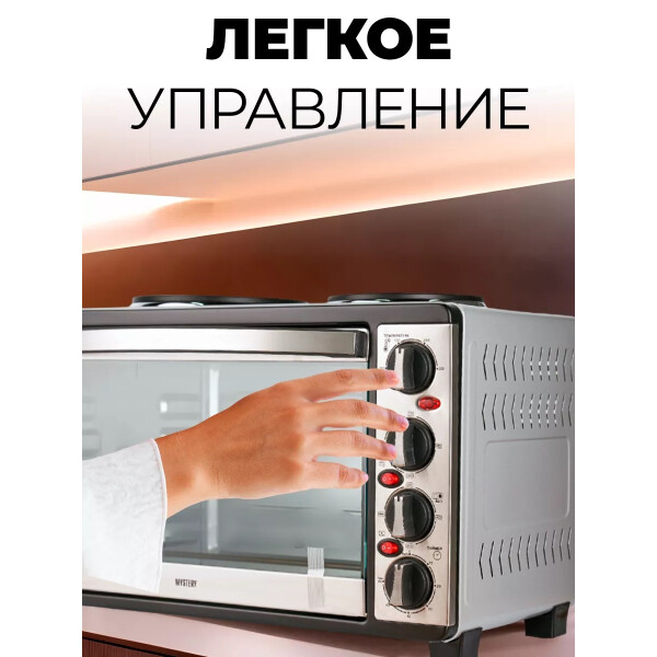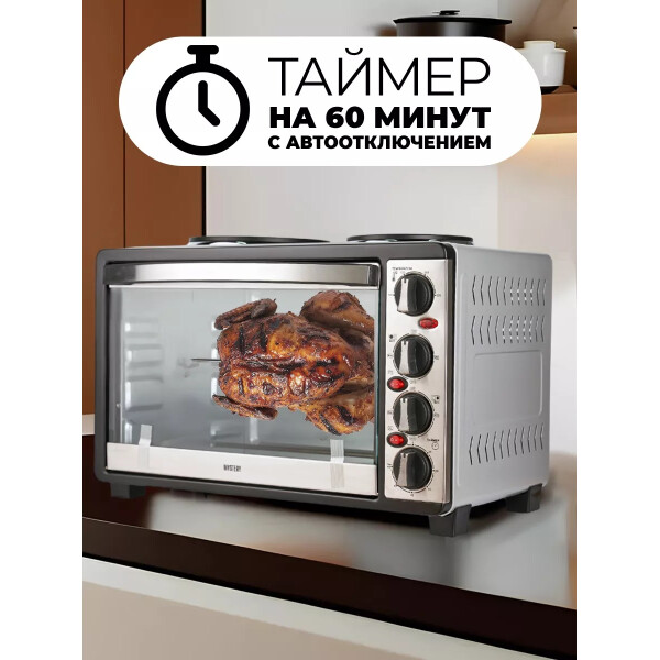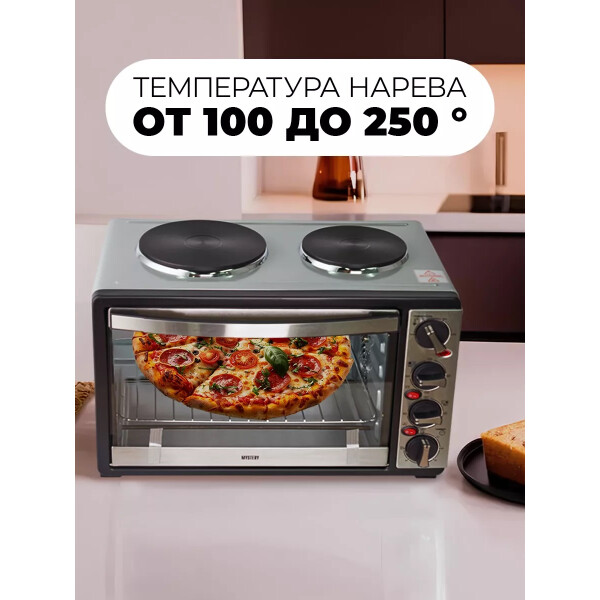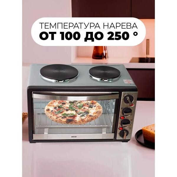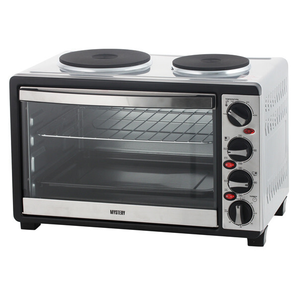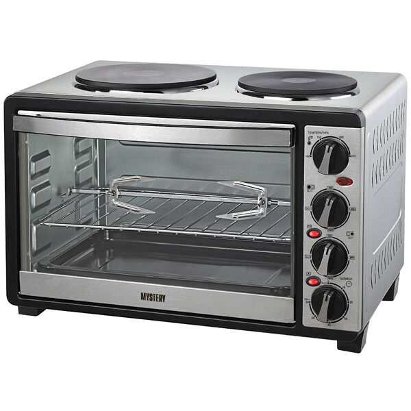 Универсальная и многофункциональная электропечь Mystery MOT-3330 выполнена в металлическом корпусе серебристого цвета. Благодаря компактным размерам и небольшому весу (менее 10 кг) это устройство можно с легкостью разместить даже на самой маленькой кухне. Также, несмотря на всю свою компактность, данная мини-печь имеет две конфорки ( мощностью 1000 и 600 ватт) и полноценный духовой шкаф (мощность 1500 Вт).Mystery MOT-3330 оснащена режимом конвекции, который способствует равномерной циркуляции воздуха в духовке во время приготовления блюд. Именно такой режим работы позволяет Вашим блюдам равномерно прогреться и запечься. Также готовить с комфортом Вам позволит набор аксессуаров, который поставляется в комплекте с печью. В него входят вертел, поддон, противень, решетка и удобный ухват. С такими приспособлениями процесс приготовления пищи станет значительно легче, а Ваш рацион пополнится новыми рецептами.
