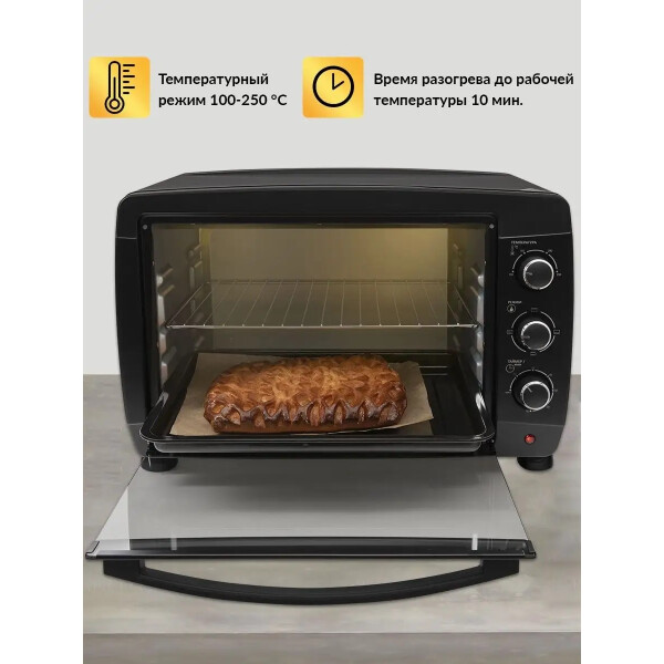 Модель объемом 48л и мощностью 2кВт имеет 3 режима работы, а также понятное механическое управление, поворотные ручки позволяют легко регулировать режимы, температуру и время приготовления. Температура нагрева печи от 100 до 250 С.