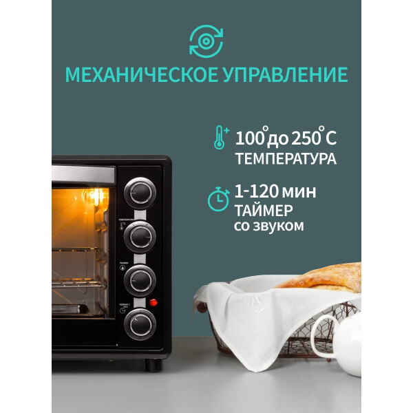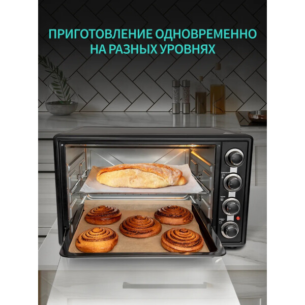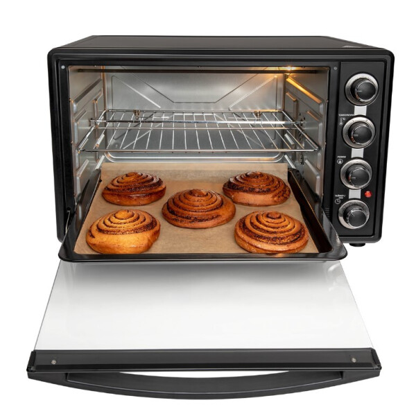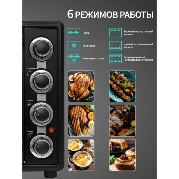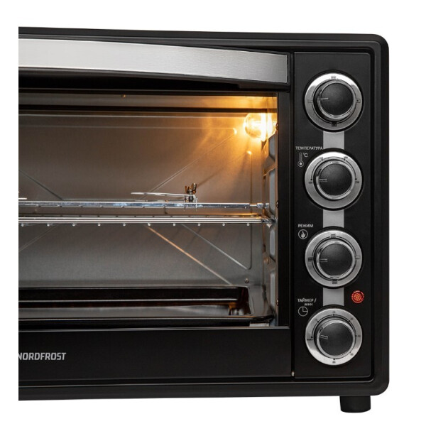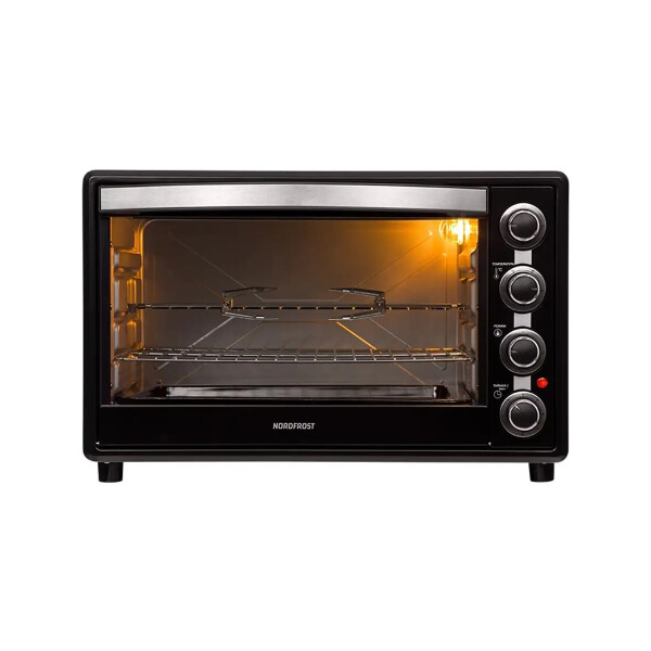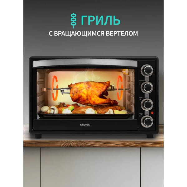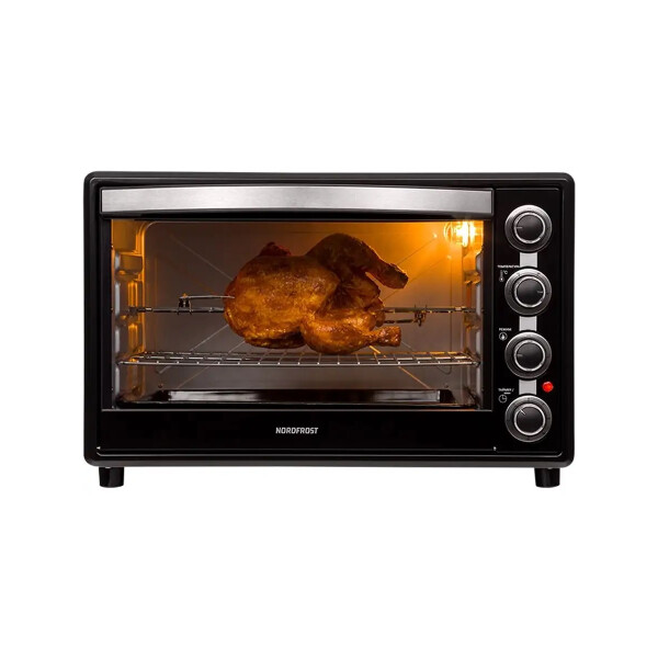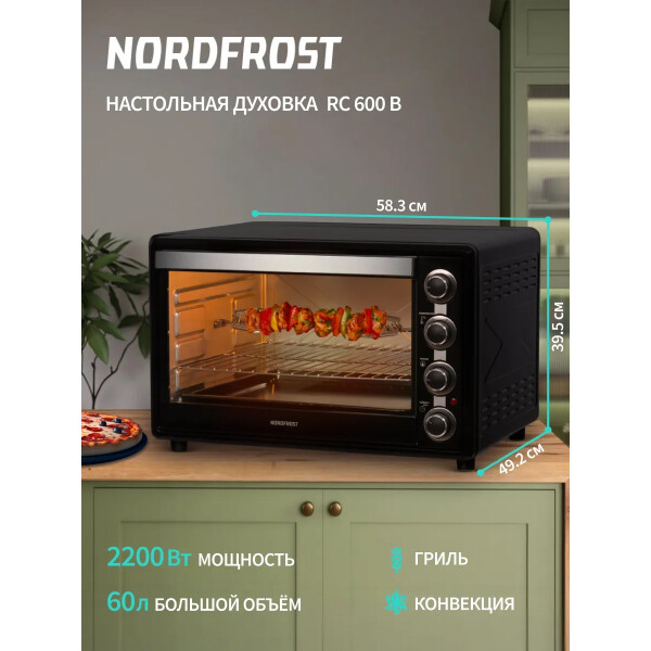 Электрическая мини-печь NORDFROST RC 600 B это большая настольная духовка, которая станет незаменимой помощницей на вашей кухне! Электропечь предназначена для выпекания хлеба, пирогов, тортов, пирожков, а также для приготовления мясных, рыбных и овощных блюд. Высокая мощность модели 2,2 кВт и функция конвекции обеспечат быстрое и равномерное приготовление продуктов в больших порциях. Объем электрический настольной духовки 60 л. Она оснащена 6 режимами работы: гриль; конвекция; конвекция + гриль; верхний нагревательный элемент; нижний нагревательный элемент; верхний и нижний нагревательный элементы. С помощью режима Гриль с вращающимся вертелом, печь позволяет готовить мясо большим куском, целую курицу или рыбу с хрустящей золотистой корочкой. Наличие вертела обеспечит равномерную прожарку со всех сторон. Механическое управление настольной духовкой интуитивно понятное, осуществляется посредством регуляторов. Температура нагрева печи от 100 до 250 С.