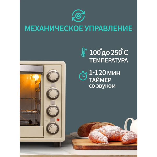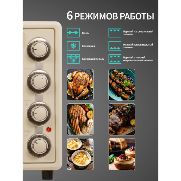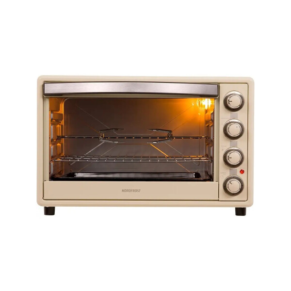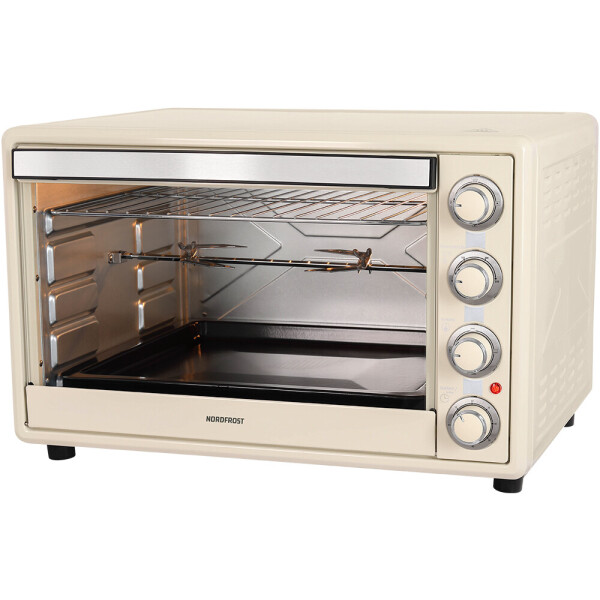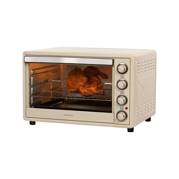Электрическая мини-печь NORDFROST RC 600 Y это большая настольная духовка, которая станет незаменимой помощницей на вашей кухне! Оригинальный дизайн в современном стиле мини-печи сочетает в себе высокую функциональность и удобство использования. Электродуховка предназначена для выпекания хлеба, пирогов, тортов, пирожков, а также для приготовления мясных, рыбных и овощных блюд и даже пиццы! Специальный круглый противень для приготовления пиццы идет в комплекте. Высокая мощность модели 2,2 кВт и функция конвекции обеспечат быстрое и равномерное приготовление продуктов в больших порциях. Объем электрической настольной духовки 60 л. Она оснащена 5 режимами работы: верхний нагревательный элемент + гриль; нижний нагревательный элемент; верхний и нижний нагревательный элементы + гриль; верхний нагревательный элемент + гриль + конвекция; верхний и нижний нагревательный элементы + гриль + конвекция. С помощью режима Гриль с вращающимся вертелом, печь позволяет готовить мясо большим куском, целую курицу или рыбу с хрустящей золотистой корочкой. Наличие вертела обеспечит равномерную прожарку со всех сторон. Механическое управление настольной духовкой интуитивно понятное, осуществляется посредством регуляторов.