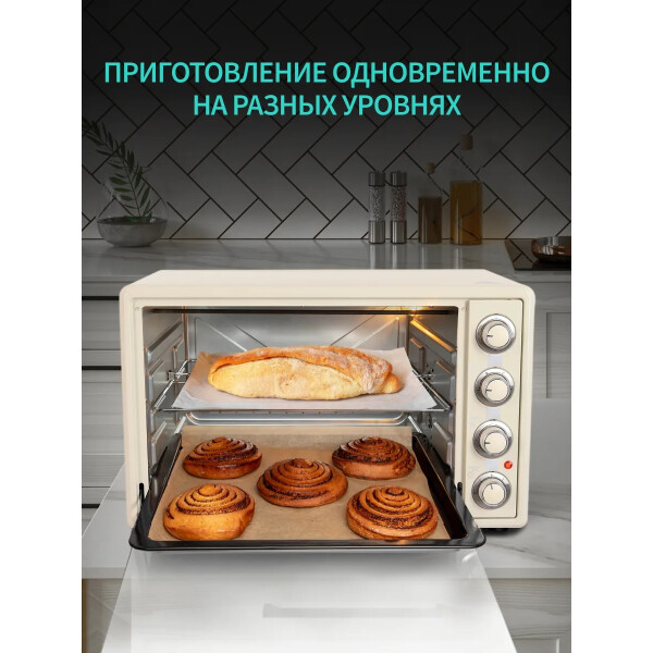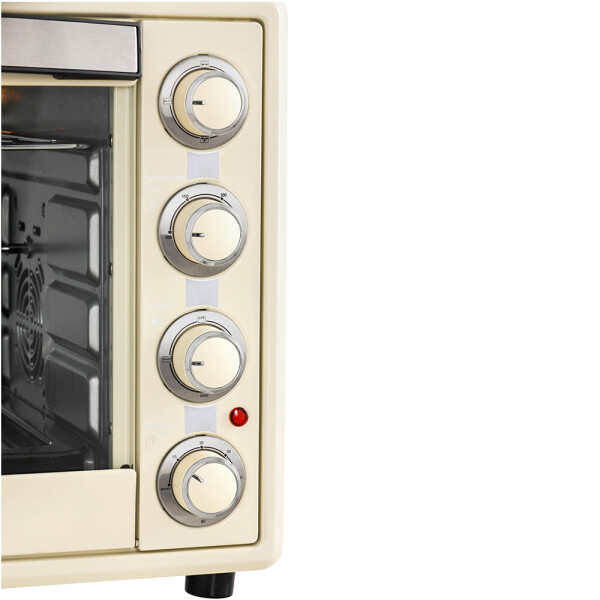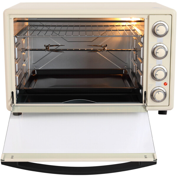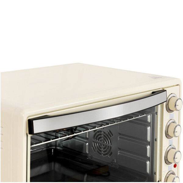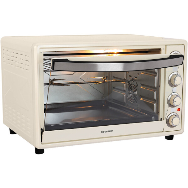 Модель NORDFROST RC 600 Y оснащена таймером отключения, которым можно запрограммировать точное время приготовления до 120 минут. Когда заданное время пройдет, таймер автоматически выключит духовку и напомнит об этом звуковым сигналом. Вместительный глубокий противень и решетку можно использовать для приготовления одновременно на разных уровнях духового шкафа. Размер противня: 43, 35*40,1*2,54 см. Круглый противень для пиццы диаметром 31,5 см. в комплекте. Также прудсмотрен ухват для противня и решетки, чтобы быстро и безопасно извлечь горячие блюда из духовки. Поддон для крошек позволяет сэкономить время на очистку духового шкафа и служит дополнительной защитой от возгорания остатков пищи, попадающих на нагревательный элемент. Кроме того, в комплекте предусмотрен вертел для гриля. Стационарные направляющие в мини-печи представляют собой выемки на внутренней поверхности модели, на которые как раз опирается противень или решетка. Термоустойчивый пластик ножек не оставляет царапин на столе и препятствует скольжению по поверхности. Высокие ножки способствуют уменьшению воздействия горячих температур на столешницу. Внутреннее покрытие духовки оцинкованная сталь. Электрическая мини-печь, благодаря своему высокому функционалу и оптимальным размерам подойдет для использования на кухне в городской квартире, доме или даче.