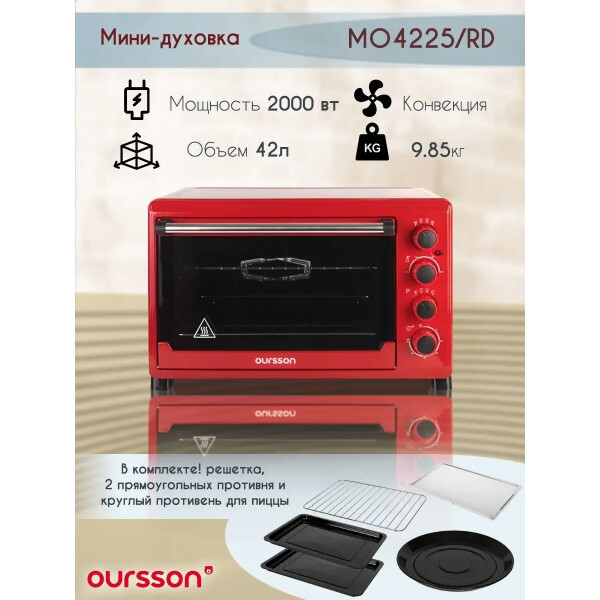 Современная электрическая мини-печь OURSSON MO4225 объемом 42 литров это незаменимый помощник на вашей кухне и полноценная замена стационарной духовке. Печь имеет 12 режимов приготовления, среди них стоит отметить наличие гриля, а также конвекции циркуляции горячего воздуха вокруг продукта. Благодаря ей выпечка пропекается более равномерно, получается вкусной и румяной, мясо или птица на вертеле с хрустящей корочкой, а время приготовления сокращается. Таймер с автоотключением позволяет задать время приготовления, а звуковой сигнал известит о завершении приготовления. В комплект входят: решетка, 2 прямоугольных противня и круглый противень для пиццы, вертел и две ручки для решетки и вертела. Прибор удобен в эксплуатации и уходе, имеет внутреннюю самоочищающуюся поверхность EasyClean и специальный поддон для крошек и жира.