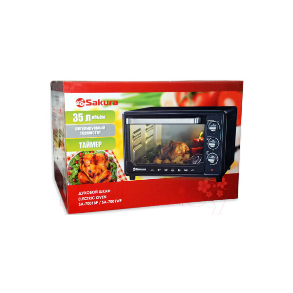 Мини-печь Sakura SA-7001BP привлекает соотношением стоймости, качества и функциональности. Устройство с лёгкостью впишется в интерьер любой кухни. Стеклянная дверца в конструкции печи позволяет контролировать процесс приготовления блюд визуально. 35-литровая духовка быстро разогревается благодаря высокой мощности 1600 Вт. Sakura SA-7001BP оснащена удобным механическим управлением. Поворотные переключатели регулируют температуру и время приготовления.