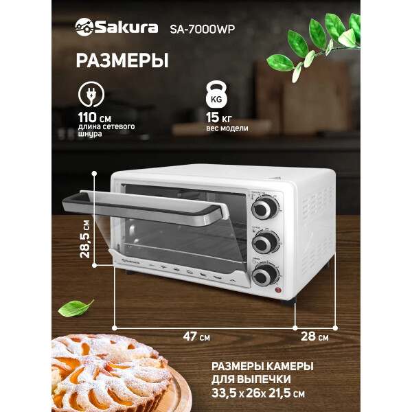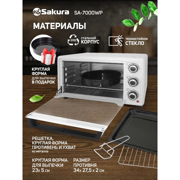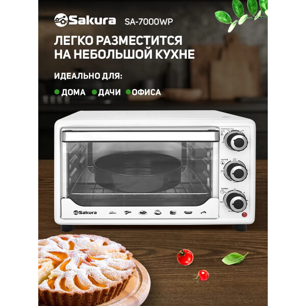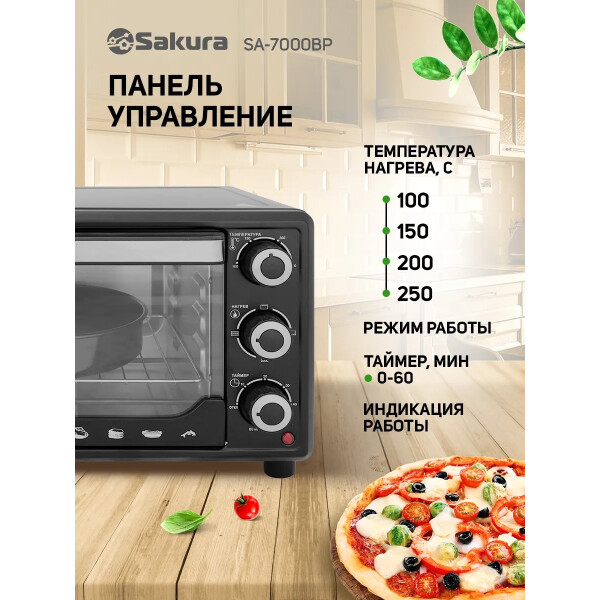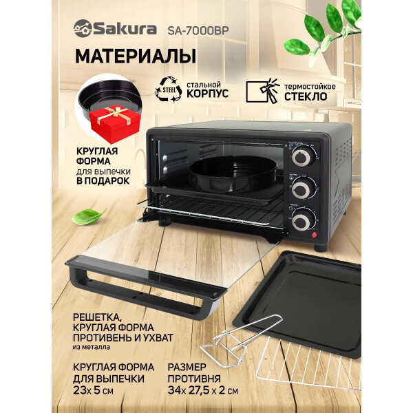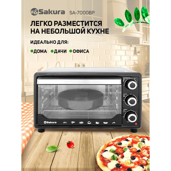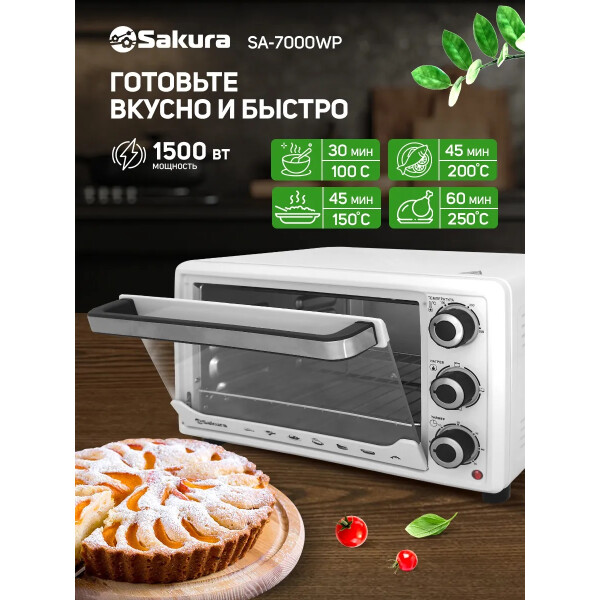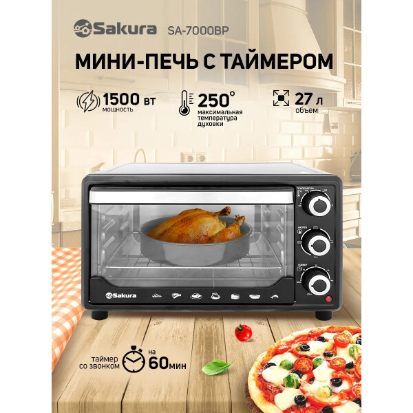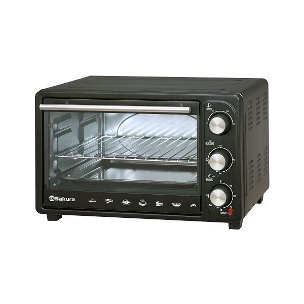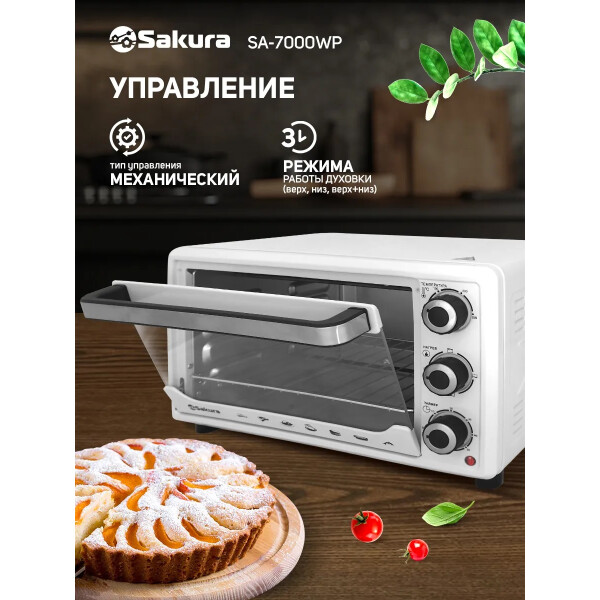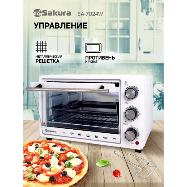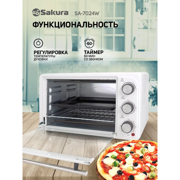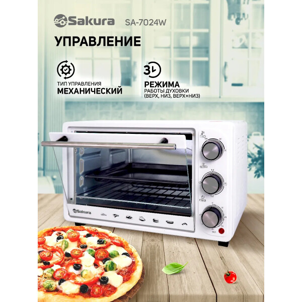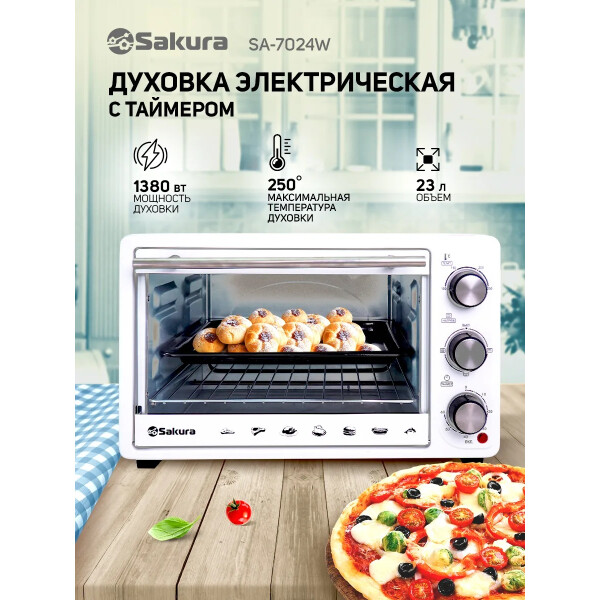 Объем 23 л, духовка 1380 Вт, механическое управление, 3 режима работы (верх, низ, верх+низ), таймер на 60 минут со звонком, регулировка температуры духовки, комплектация - металлическая решетка, противень и ухват.