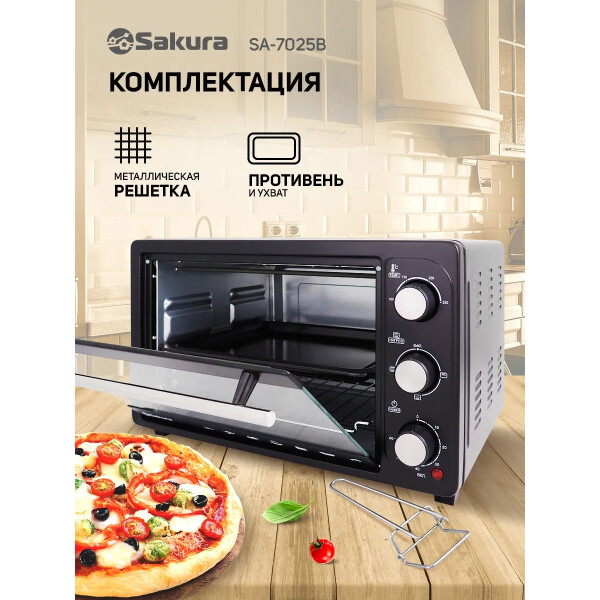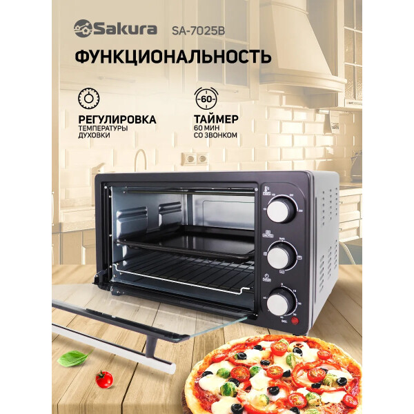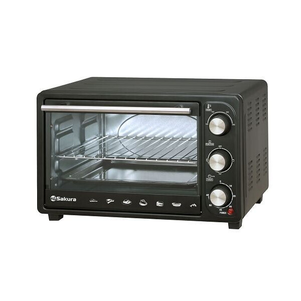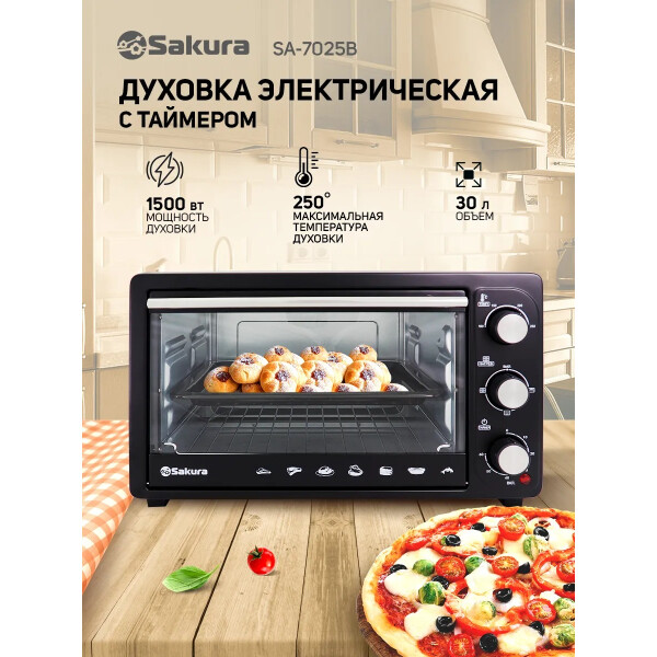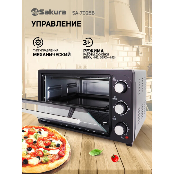 Объем 30 л, мощность духовки 1500 Вт, механическое управление, 3 режима работы духовки (верх, низ, верх+низ), таймер на 60 минут со звонком, регулировка температуры духовки, комплектация - металлическая решетка, противень и ухват.