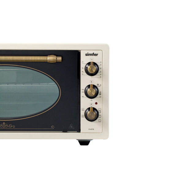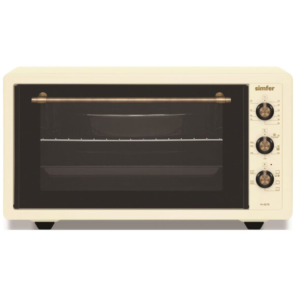 Электропечь Simfer M4579 отличается компактностью, при этом способна заменить полноценную духовку с грилем. Габариты представленной модели составляют 59х33х47 см. Корпус устройства оформлен в бежевой расцветке и выполнен в ретро-стилистике. Такая печь станет оптимальным вариантом для небольшой квартиры или дачи. Мощность модели составляет 1400 Вт.