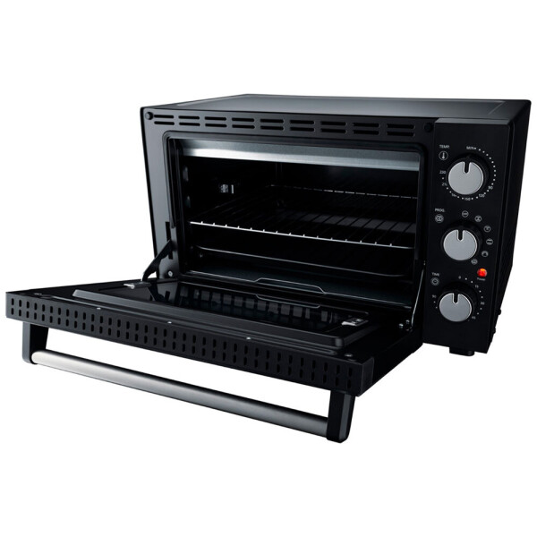 Ручка защищена от нагревания, что позволит не использовать дополнительно прихватки и исключит ожоги. Справа от дверцы находятся поворотные переключатели, при помощи которых вы сможете настроить температуру, время работы печи, а также установить программу.