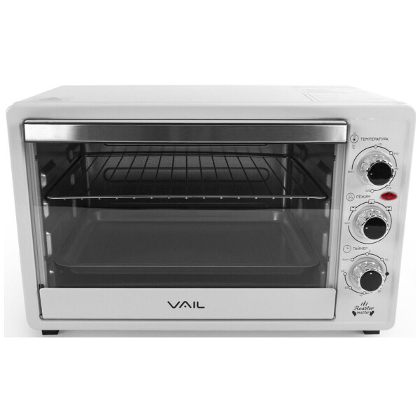 Стильный дизайн духового шкафа Vail-5000, выполненный в белом цвете, а также компактные размеры прибора, позволят ему вписаться в интерьер абсолютно любой кухни. Эта модель оптимальное решение для небольшой кухни, не оборудованной стационарной духовкой или для дачного домика. Основание духового шкафа включает в себя прочные ножки, способствующие повышению устойчивости на любой поверхности. Вы можете выбрать один из 4 режимов работы прибора, чтобы обеспечить оптимальные условия для приготовления конкретного блюда. Так, нагревательные элементы можно включить снизу, сверху или одновременно, благодаря этому тепло равномерно распределяется по всему объему духового шкафа, и блюдо пропекается со всех сторон. А так же поддерживается режим приготовления с использованием таймера.