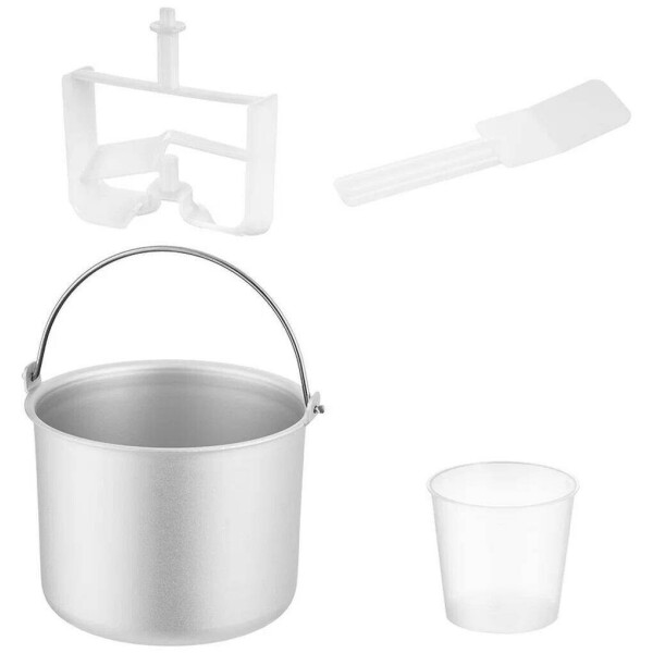В комплектацию с устройством входит также: лопатка для смешивания, 1,2 литровое ведёрко, мерный стаканчик и лопатка-скребок для мороженого.