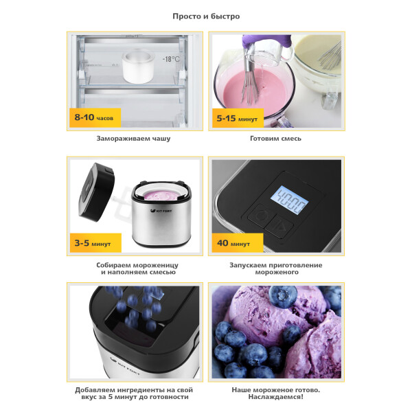 Полуавтоматическая мороженица поможет приготовить настоящее мороженое, сорбет, джелато, замороженный йогурт из натуральных продуктов. Имеет стильный металлический корпус, снабжена системой смешивания и имеет чашу заполненную хладагентом для охлаждения мороженого во время приготовления.