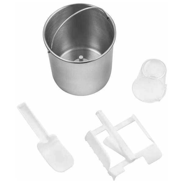 В комплектацию с устройством входит также: лопатка для смешивания, 1,5 литровое ведёрко, мерный стаканчик и лопатка для мороженого.