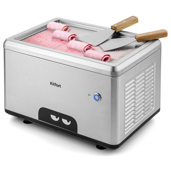 После включения металлическая поверхность мороженицы становится холодной уже через 8-10 минут. На ней удобно распределять смесь, промораживать её и соскребать. Бортики не позволят вытечь смеси или упасть твёрдым ингредиентам.