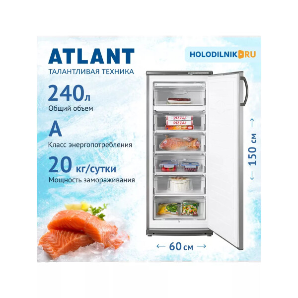 За одни сутки морозильный шкаф ATLANT М 7184-070 может охладить и заморозить до 20 кг продуктовых запасов, а также приготовить 2,2 кг льда, потребляя при этом всего 341 кВт·ч/год энергии. Внутренний объем камеры составляет 240 л. Все пространство разделено на 6 секций, где расположены 6 пластиковых ящиков для размещения провианта.