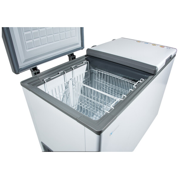 Удобный большой ларь с двойной глухой металлической крышкой. Двойная крышка обеспечивает простой доступ к нужной части ларя, сокращая потребление электроэнергии на поддержание температуры. Внутри морозильный ларь не разделен, что позволяет удобно хранить крупные и мелкие продукты.