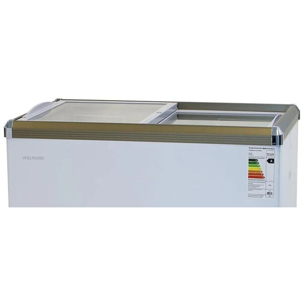 Крышка состоит из двух створок, изготовленных из закаленного стекла, с рукоятями. Она запирается на замок, что обеспечивает сохранность содержимого ларя. Устройство полезным объемом 360 л весит 70 кг. Маневренные ролики позволяют перемещать его в нужное место. Предусмотрена ручная разморозка.