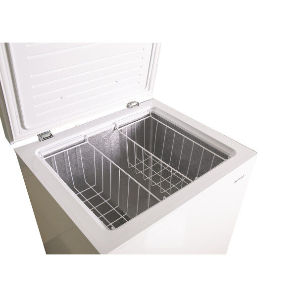 Вместительная горизонтальная морозильная камера ZARGET ZCF 164W с двумя корзинами в комплекте, мощностью заморозки 6,5 кг/сутки и полезным объемом 142 литра.