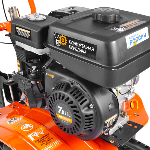 Мотоблок Patriot Калуга – модифицированный мощный бензиновый мотоблок с пониженной передачей и чугунным шестеренчато-цепным редуктором. Мотоблок оснащен четырехтактным двигателем с воздушным охлаждением.