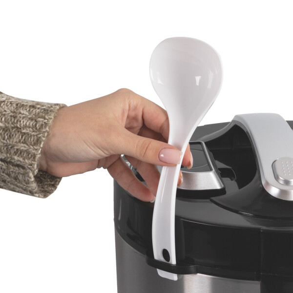 Endever поработали над эргономикой мультиварки: оборудовали ее клапаном выпуска пара, держателем для ложки, съемным каплесборником для конденсата.
