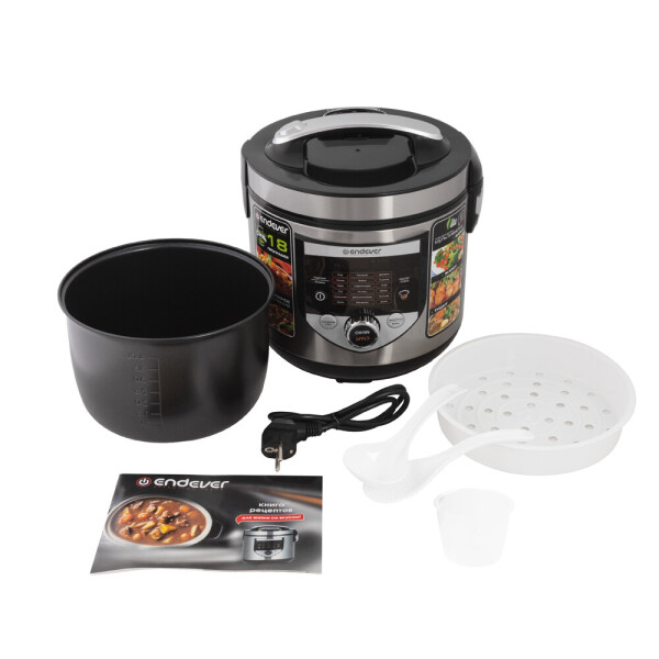 Мультифункциональная помощница ENDEVER VITA-61 комплектуется приятными аксессуарами: книгой рецептов, контейнером-пароваркой, черпаком для супа, ложкой для крупы и мерным стаканчиком.