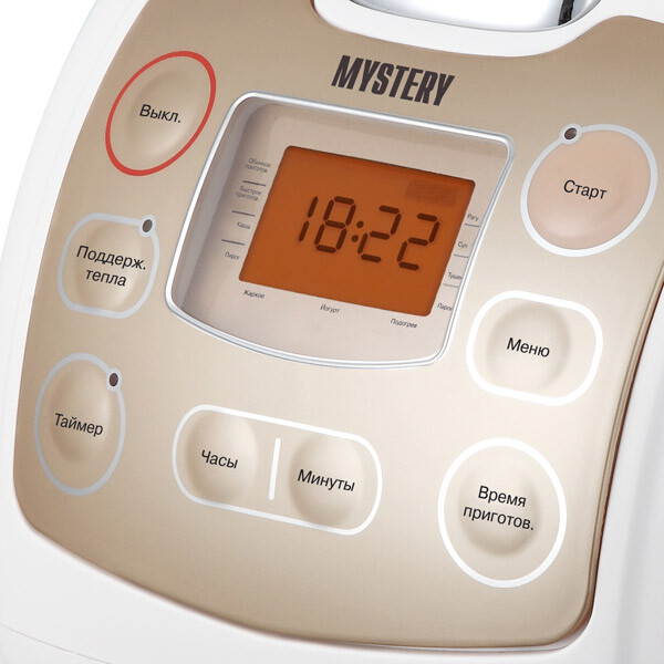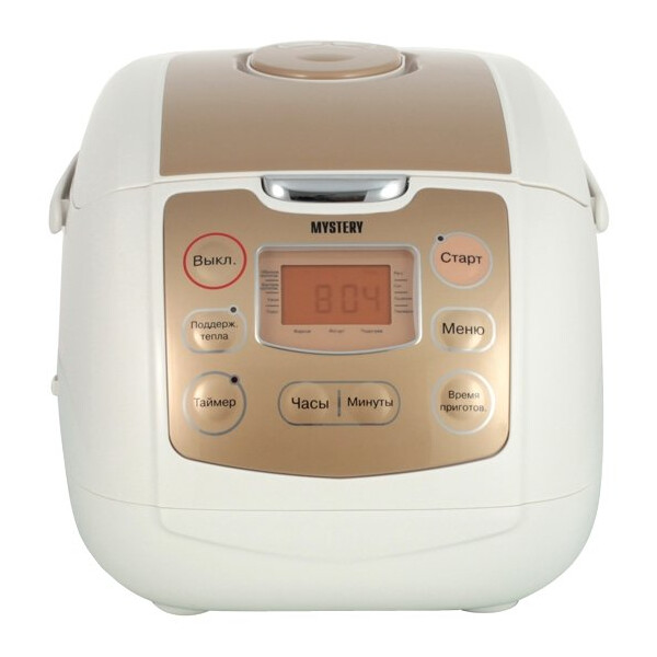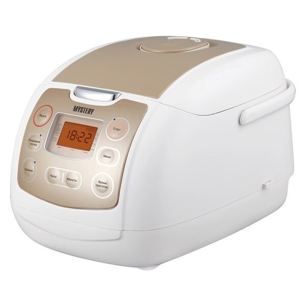 Мультиварка Mystery MCM-1019 имеет приятный дизайн - корпус выполнен в белом цвете, на котором ярким акцентом выделяется вставка приятного оттенка, она же панель управления с которой очень удобно руководить программами, и наблюдать за временем приготовления, отображающиеся на цифровом дисплее с оранжевой подсветкой. Мультиварка Mystery MCM-1019 укомплектована 5-ти литровой чашей с антипригарным покрытием, предназначенной для приготовления пищи, а также паровой емкостью для приготовления на пару, мерной ложкой и стаканом, лопаткой для перемешивания.