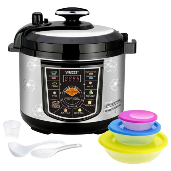 Vitesse VS-3003 это мультиварка-скороварка, которая обеспечивает оптимальное приготовление различных блюд при высоком и нормальном давлении. При закрытом клапане выпуска пара мультиварка превращается в скороварку и готовит за считанные минуты. При открытом клапане готовка происходит при обычном давлении. Функция голосового сопровождения озвучит последовательность действий при готовке, а также подскажет время начала и завершения работы.