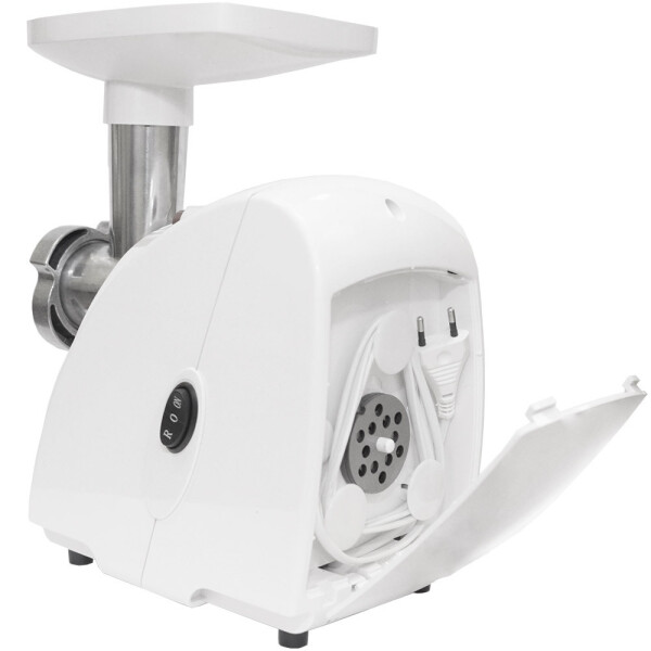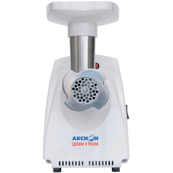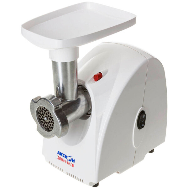 Мясорубка Аксион М 31.01 белого цвета оснащена пластиковым корпусом и удобным лотком. Разборная конструкция упрощает очистку рабочих элементов. Данная модель весит 4 кг и имеет компактные размеры 17x32x26 см, что позволяет установить технику в любой части кухни. Конструкция отличается устойчивостью за счет наличия прорезиненных ножек. Мощность двигателя достигает 1500 Вт, что позволяет обрабатывать различные виды мяса с производительностью до 1700 г/мин. Параметры мясорубки позволяют использовать посуду с высотой до 11 см. При непрерывной работе важно делать остановки через каждые 15 минут, поскольку в данной модели не предусматривается система защиты от перегрузок. В корпусе Аксион М 31.01 предусмотрено 2 встроенных отсека. В одном хранится сетевой шнур, длина которого 0,9 м. Другой отсек позволяет хранить насадки, которые приобретаются отдельно. Предусматривается функция реверса (движения в обратную сторону).