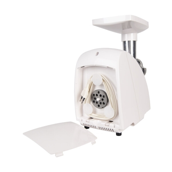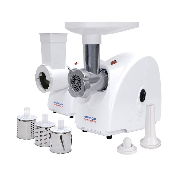 Предусматривается наличие 3 перфорированных дисков для фарша. В комплектации имеется 3 насадки для шинковки, которые хранятся во встроенном отсеке. Также корпус оснащен отдельной емкостью для хранения сетевого шнура, длина которого равна 1,4 м. Дополнительно Аксион М 31.03 имеет функцию реверса, позволяющую поворачивать шнек в обратном направлении, что делает работу более удобной.
