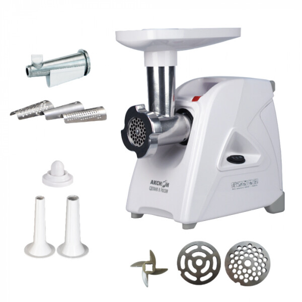 Электрическая мясорубка «Аксион» М 35.04. Макс. мощность 1500Вт, производительность – 100кг/час. С приставкой-соковыжималкой. Насадка для кеббе, насадка для набивки колбас. Отсек для хранения принадлежностей. РЕВЕРС.