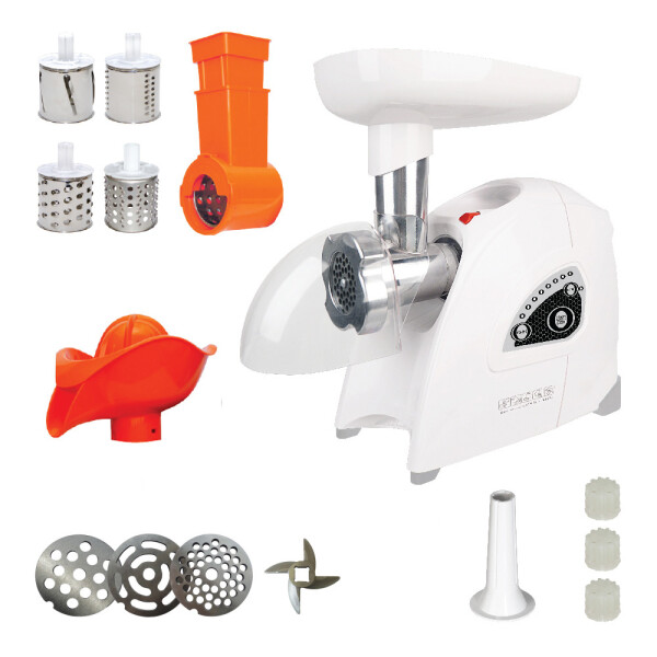 В комплекте: 2 решетки с отверстиями диаметром 5 и 7 мм, решетка с овальными отверстиями, защитный экран от брызг, нож с саблевидной режущей кромкой, приставка для изготовления колбас, приставка соковыжималка для цитрусовых, запасные колпачки 3шт. приставка овощерезка с 4-мя барабанами.