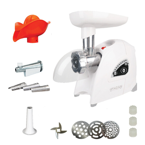 В комплекте: 2 решетки с отверстиями диаметром 5 и 7 мм, решетка с овальными отверстиями, защитный экран от брызг, нож с саблевидной режущей кромкой, приставка для изготовления колбас, приставка соковыжималка для цитрусовых, приставкой-соковыжималкой для овощей, фруктов, ягод, запасные колпачки 3шт.