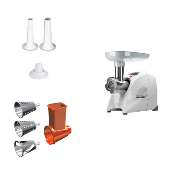 В комплект входит насадка для набивки колбас, насадка овощерезка с тремя сменными барабанами для резки ломтиками, крупного и мелкого шинкования. 2 вида решеток для получения фарша разной консистенции - с диаметром отверстий 4,9 мм и 8,5 мм.