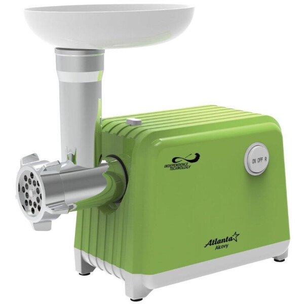 Мясорубка Atlanta ATH-3300 green представлена в стильном корпусе зеленого цвета с белыми элементами. Устройство действует с мощностью 2000 Вт, достигая производительности 2.5 кг/мин. Комфортной и безопасной эксплуатации способствует наличие системы реверса.
