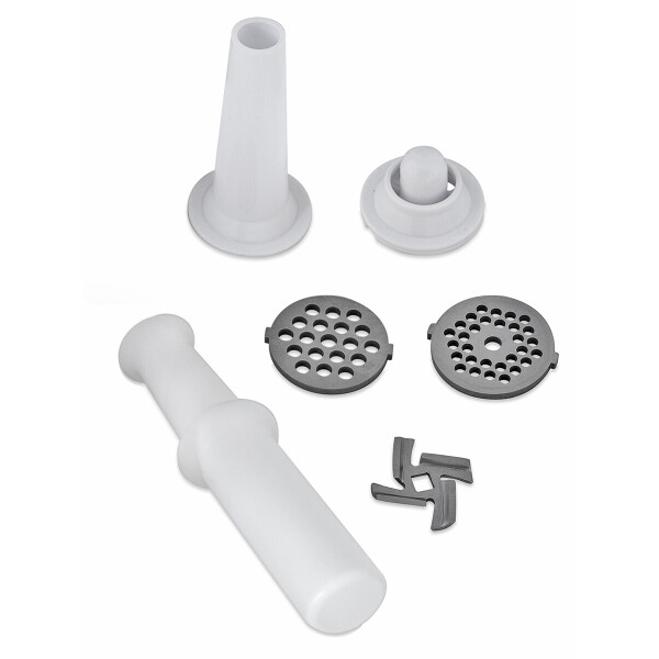 С помощью модели можно переработать до 1,8 кг ингредиентов в минуту. Максимальный уровень шума устройства 80 дБ. Для создания колбас в комплекте есть специальные насадки.