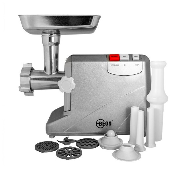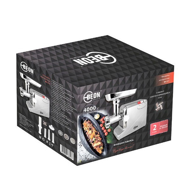 Мясорубка Beon BN-211 имеет эргономичный дизайн, 3 диска для измельчения, 3 насадки для сосисок и колбас, насадка кеббе, кованый самозатачивающийся нож из легированной стали. Медный AC-мотор оснащен принудительной системой охлаждения.