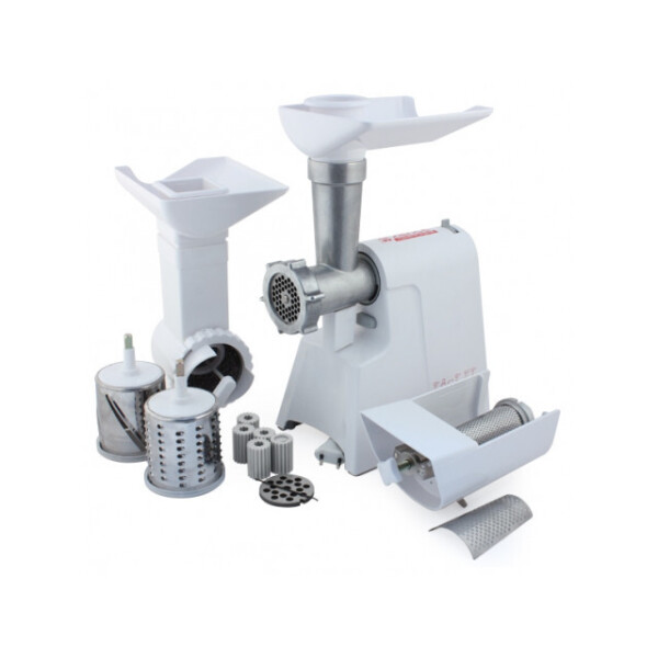Основные характеристики: Мощность номинальная - 130 Вт (максимальная - 600 Вт). Производительность 0.6 кг/мин. Насадки: Перфорированный диск для фарша есть, 2 в комплекте, диаметр отверстий 4.4 мм, 7 мм Насадка-терка есть Соковыжималка шнековая Насадка для шинковки есть Насадка для приготовления колбас нет